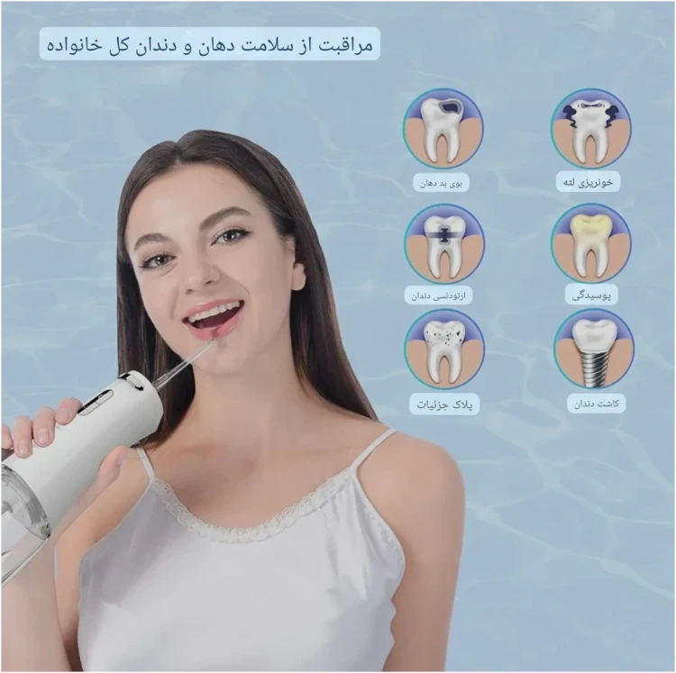 این دستگاه با نامهای واتر فلوسر، واترپیک، جرمگیر دهان و دندان، دهانشوی برقی نیز شناخته میشود و با پاشش ضربهای آب (1200–1400 پالس در دقیقه) تمام باقیماندههای غذایی و پلاکهای بین دندان را از بین میبرد.